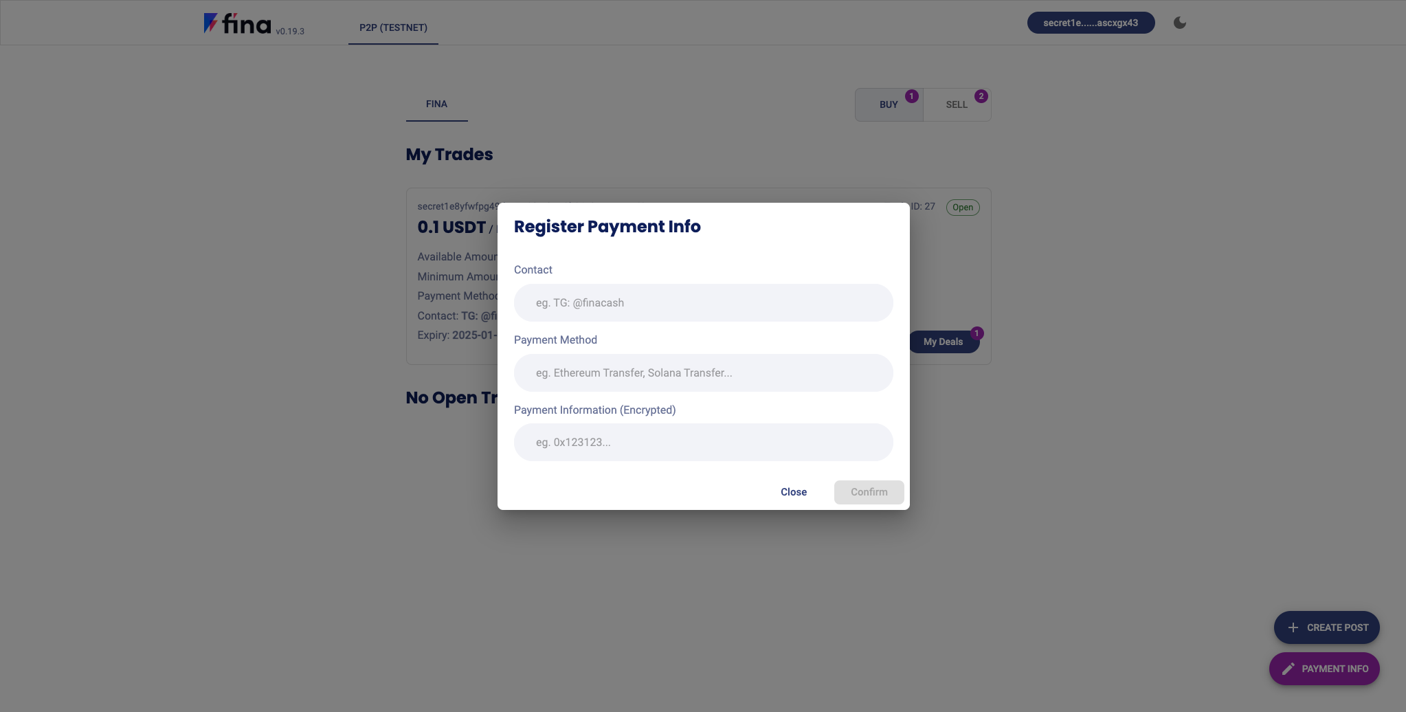 Enter your contact method, payment method and payment information. Your contact method and payment method will be visible to all Fina P2P users when you open a post, but your Payment Information will only be visible to the counterparty you are trading with.