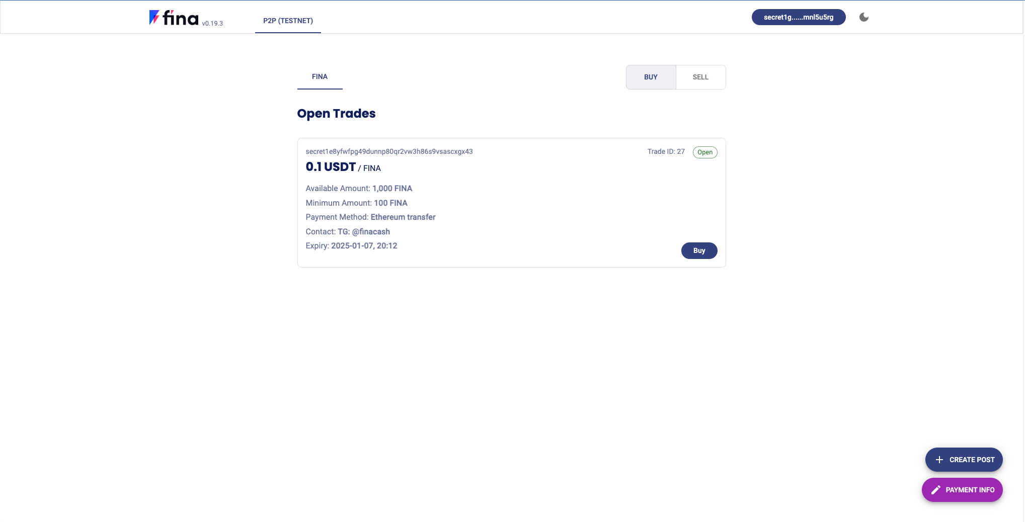Once you have set up your Payment Info, you should be able to see the Open Trades posted by other P2P users. You can choose to enter a deal by clicking the Sell or Buy button of the post, or click Create Post to open a new trade yourself.